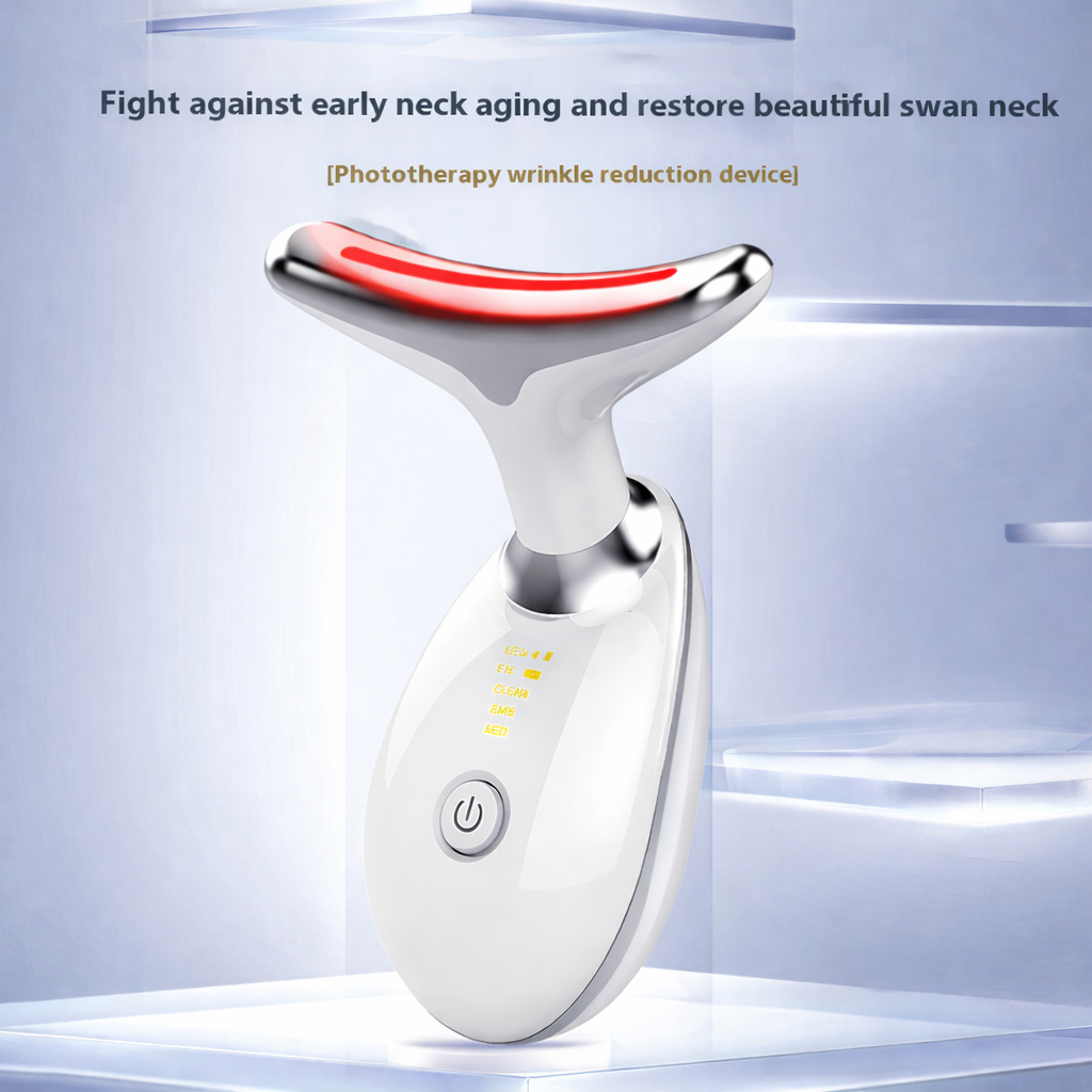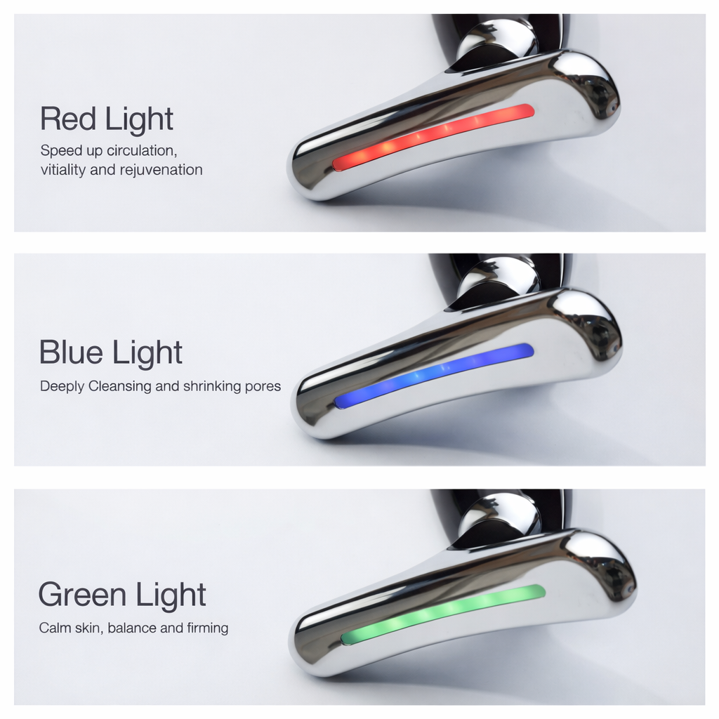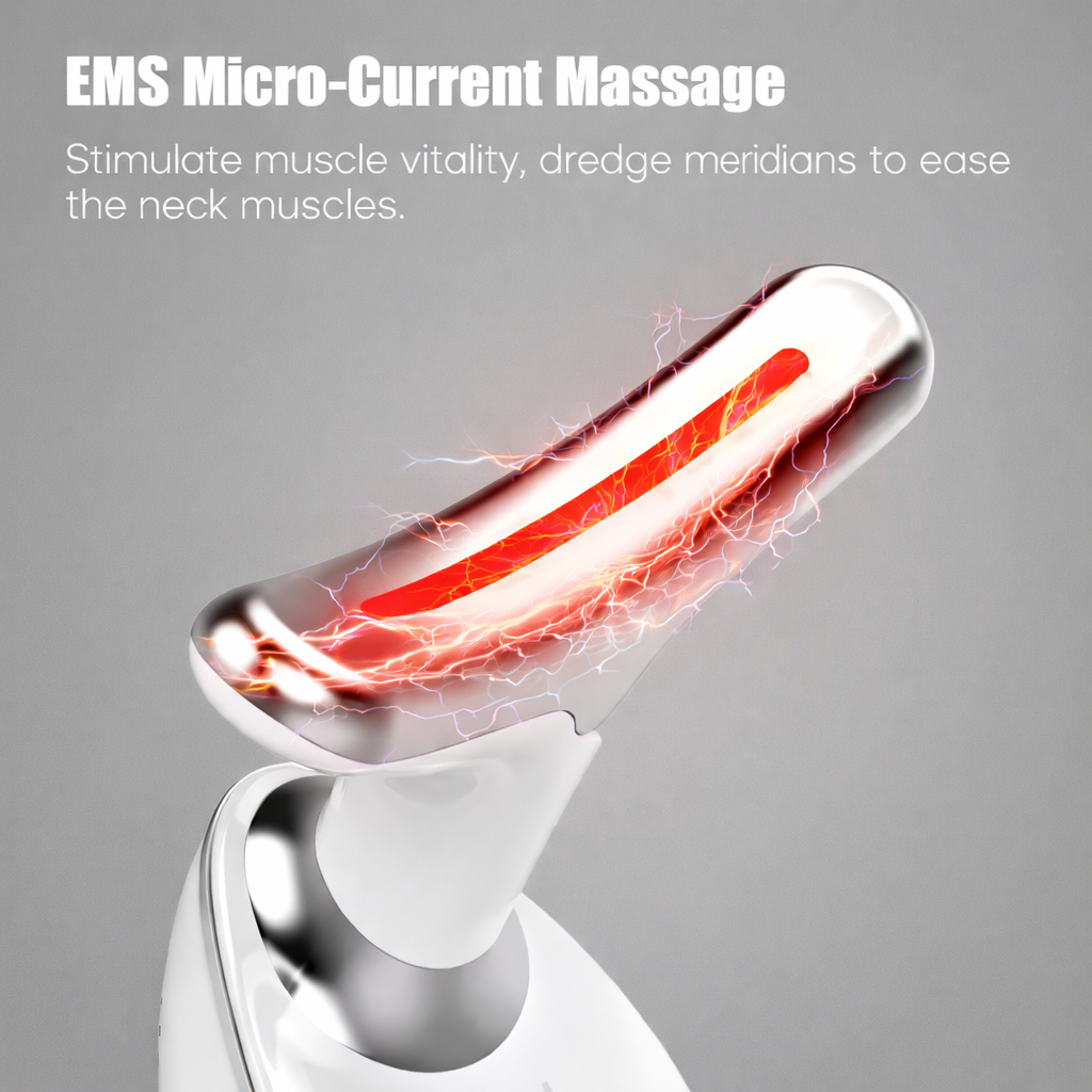 It uses EMS micro-current and LED light therapy to stimulate facial muscles, improve circulation, and help lift and smooth the skin.